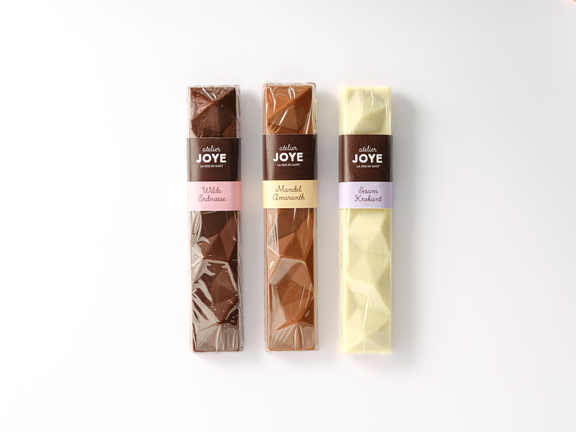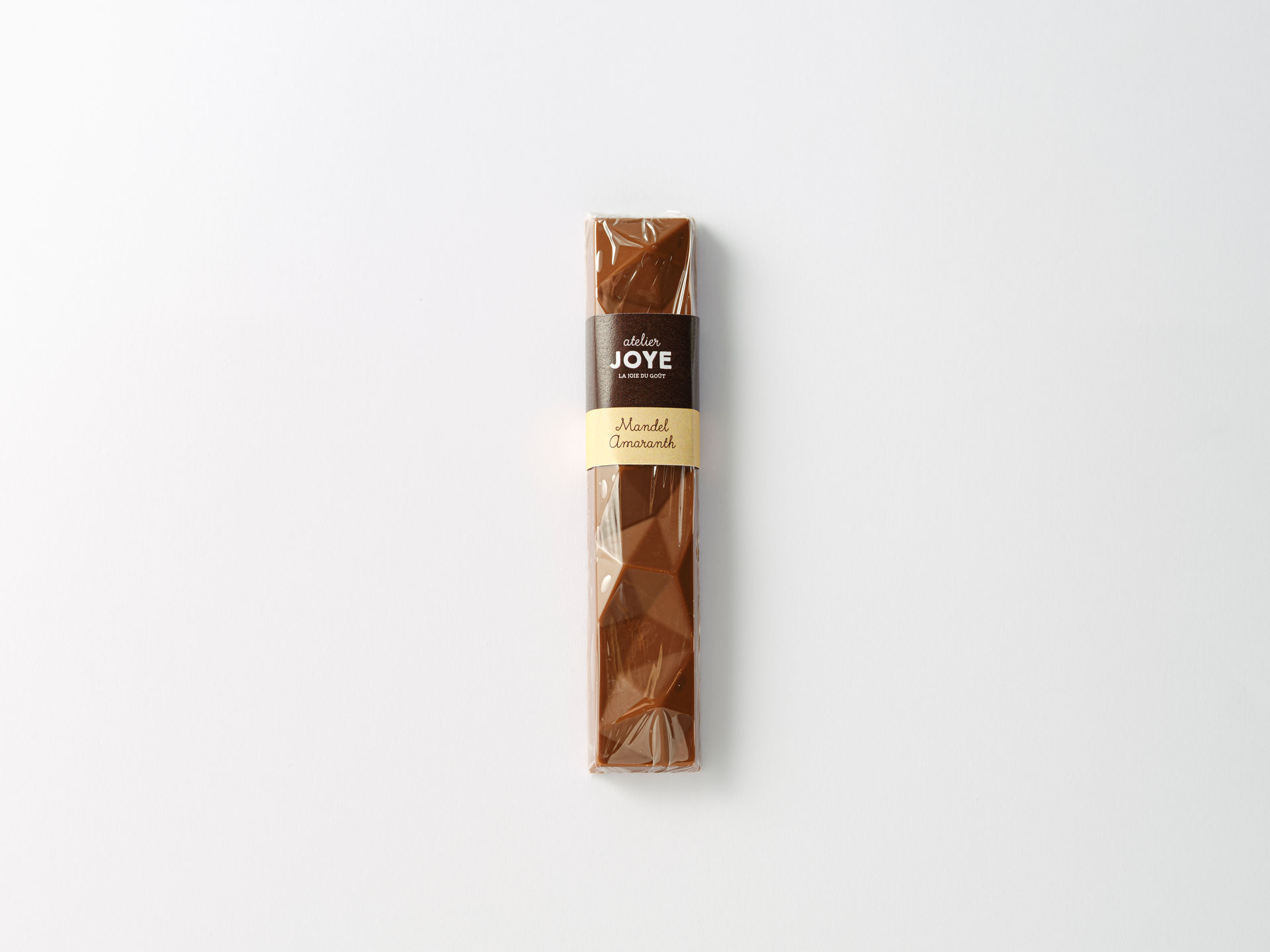 Der Riegel wurde mit der 40%igen Milchschokolade – Couverture aus Ghana ausgegossen und mit einer feinen Mandelgianduja und gepufftem Amaranth gefüllt.