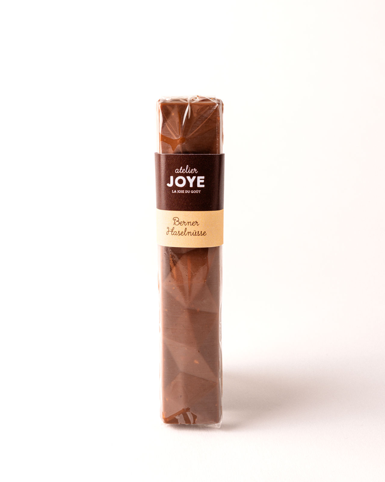 Der Riegel ist mit der 40%igen Milchschokolade – Couverture aus Ghana und gerösteten Haselnüssen aus dem Kanton Bern kombiniert. Er wurde von der Jury des Schweizer Regionalwettbewerbs 2025/2026 mit der Silbermedaille geehrt.