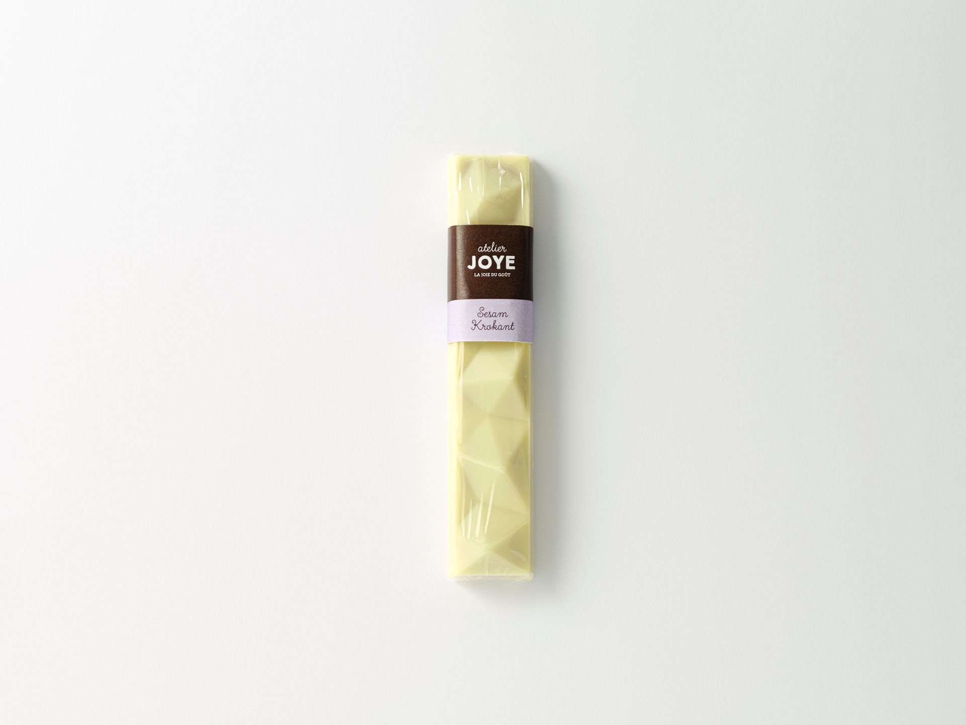 Der Riegel wurde mit der 36%igen weissen Schokoladen – Couverture aus der Dominikanischen Republik ausgegossen und mit einer feinen Mandelgianduja und Sesamkrokant gefüllt.